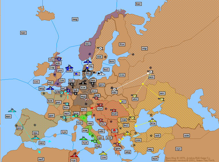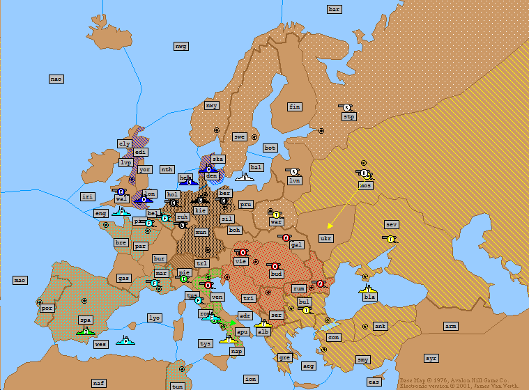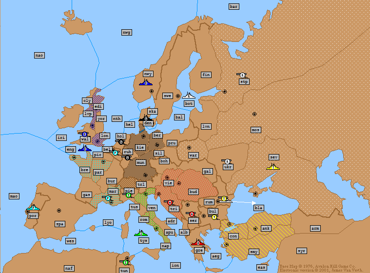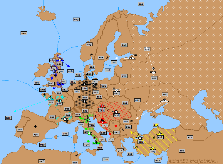 Turkey: | A Moscow → St Petersburg (*Bounce*) A Galicia → Warsaw (*Dislodged*) A Sevastopol → Rumania (*Fails*) F Bulgaria(ec) → Black Sea A Constantinople → Bulgaria F Greece → Albania F Ionian Sea → Naples |