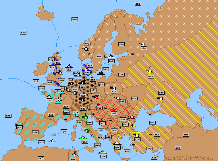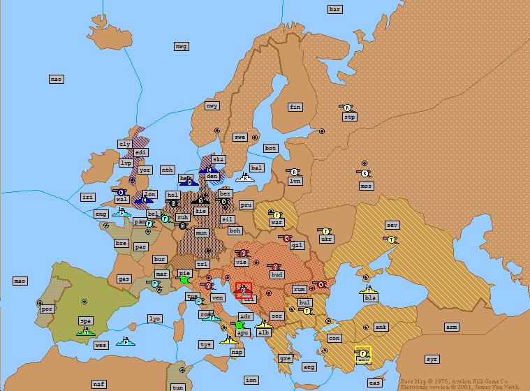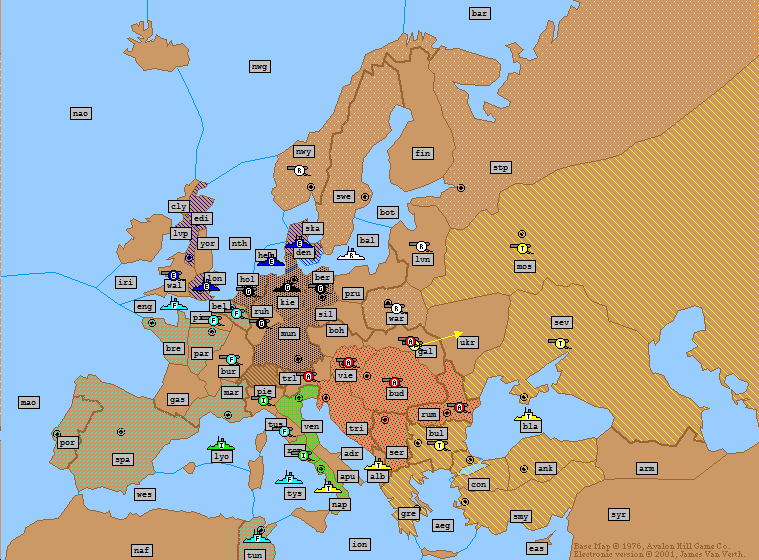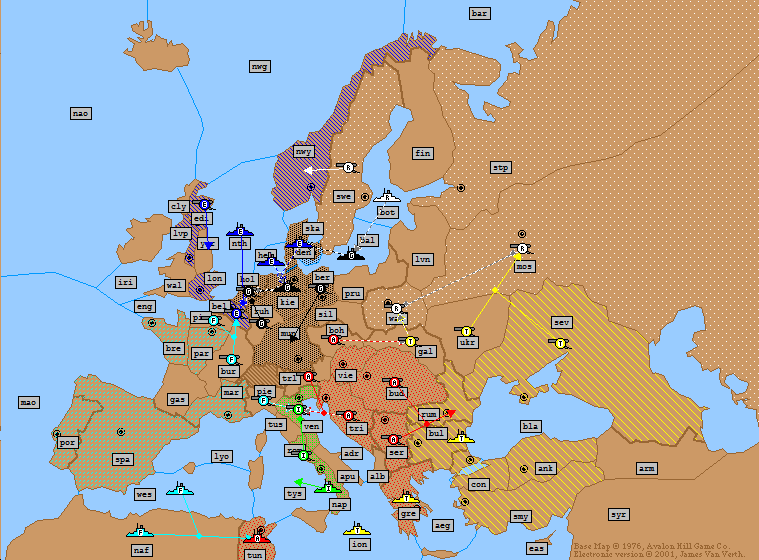 Italy: | A Piedmont S A Tyrolia → Venice A Rome → Naples (*Dislodged*) F Gulf of Lyon → Spain(sc) |