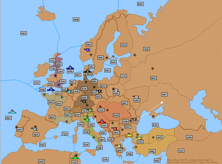 Russia: | F Gulf of Bothnia → Sweden A Warsaw → Galicia (*Fails*) F Sevastopol → Rumania (*Fails*) A Ukraine S F Sevastopol → Rumania |