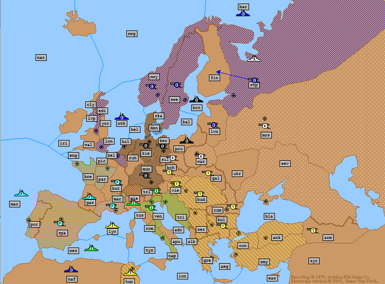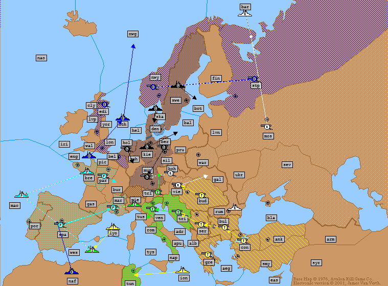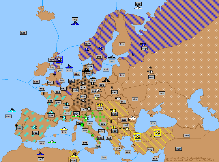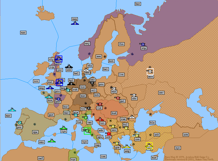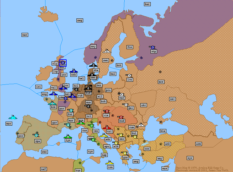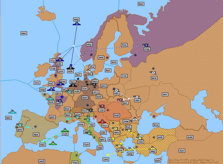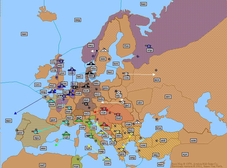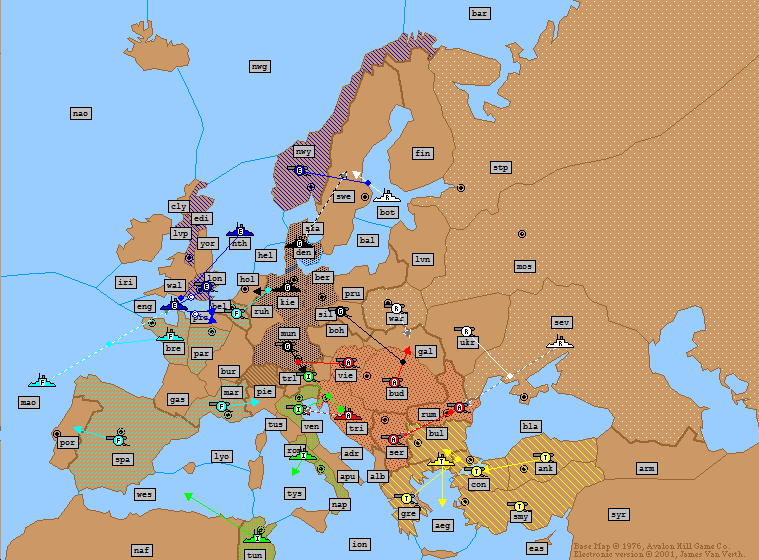 | Es wurde ein Unentschieden zwischen den Bündnissen Turkey-Russia-Italy und England-France-Germany vereinbart (jeweils 17 Supply Center) |