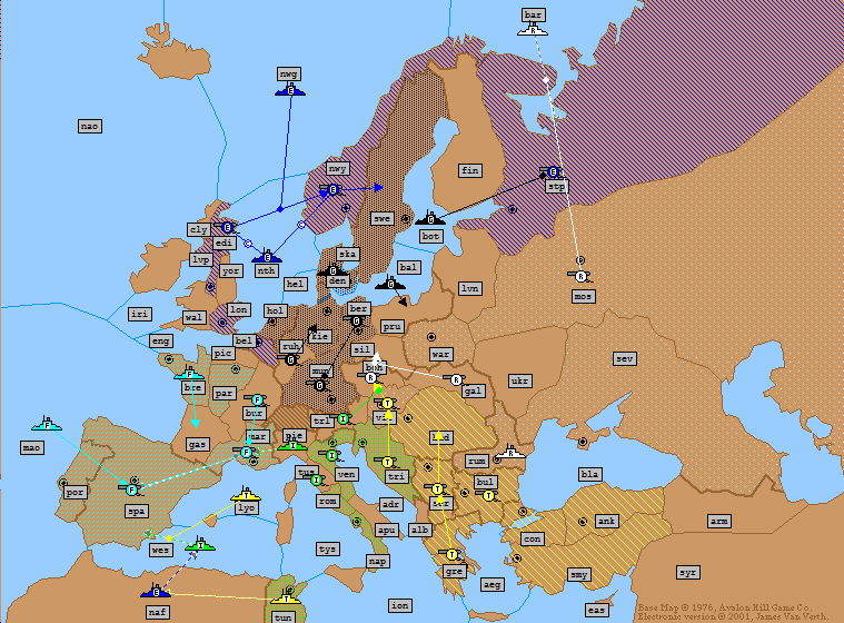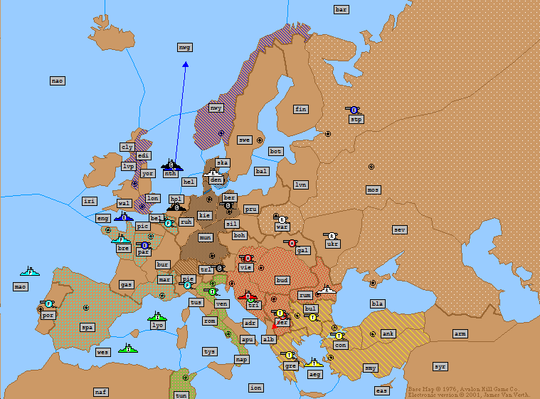 England: | F Norwegian Sea → Barents Sea A St Petersburg H (*Dislodged*) A Sweden → Livonia A Norway → Sweden A Edinburgh → Norway F North Sea C A Edinburgh → Norway F North Africa S F Mid-Atlantic Ocean → Western Mediterranean (*Cut*) |