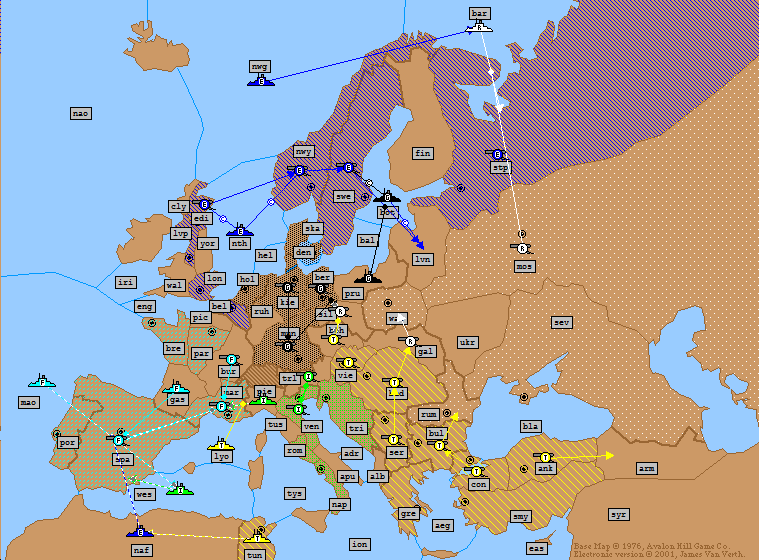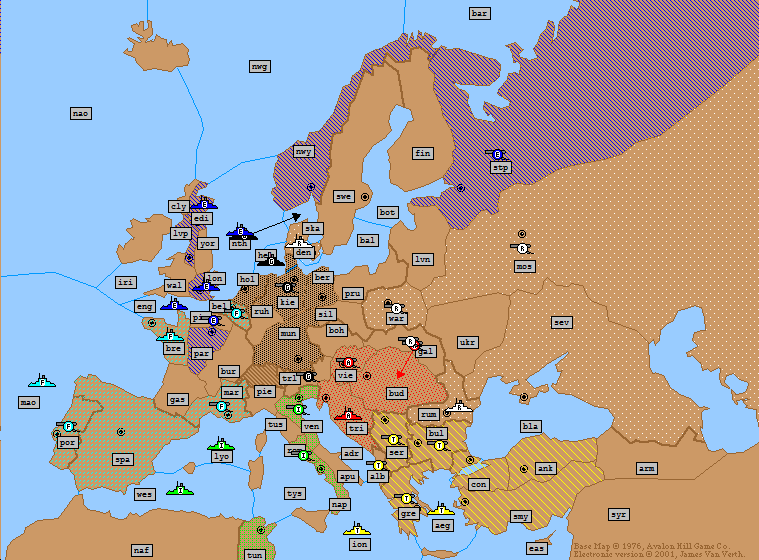 Russia: | F Denmark → Sweden A Moscow → Livonia A Warsaw H A Galicia → Budapest (*Fails*) F Rumania H |