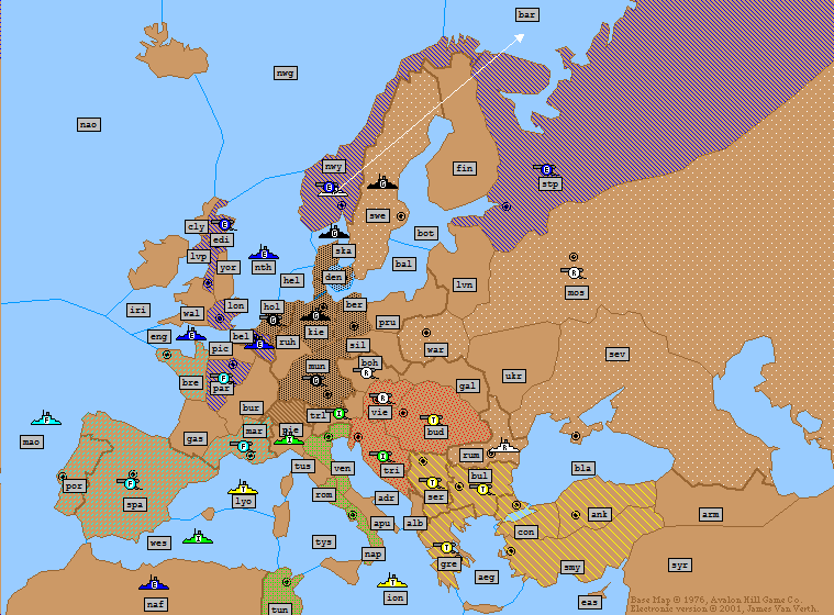 Russia: | F Barents Sea → St Petersburg(nc) (*Fails*) A Moscow S F Barents Sea → St Petersburg(nc) A Bohemia → Munich (*Fails*) A Vienna → Galicia F Rumania H |