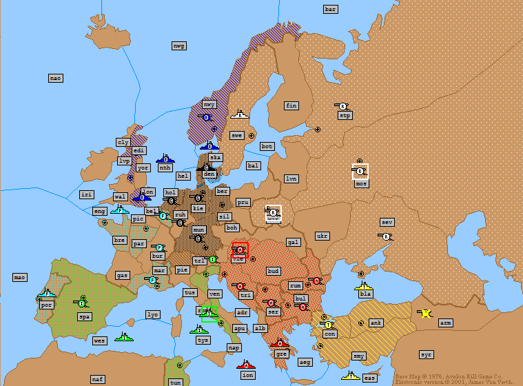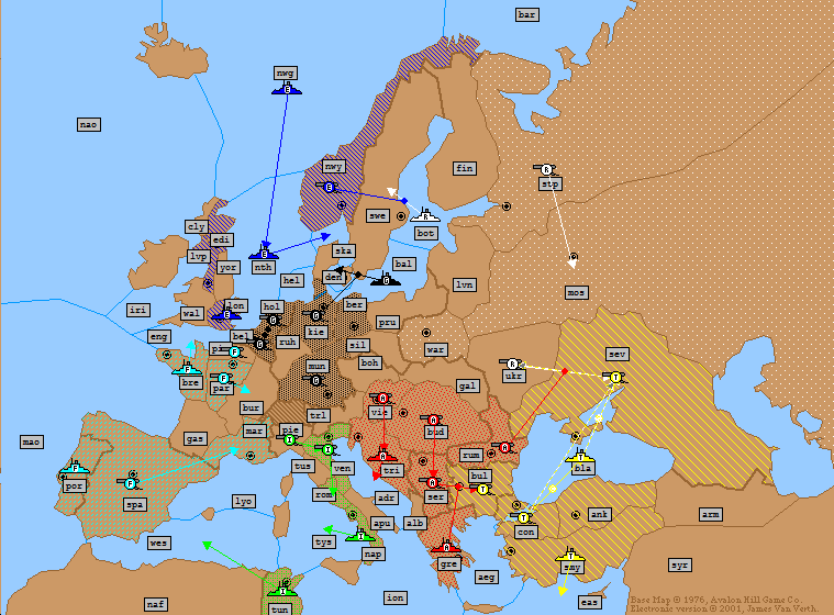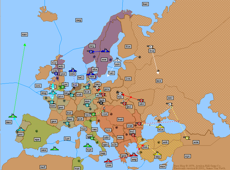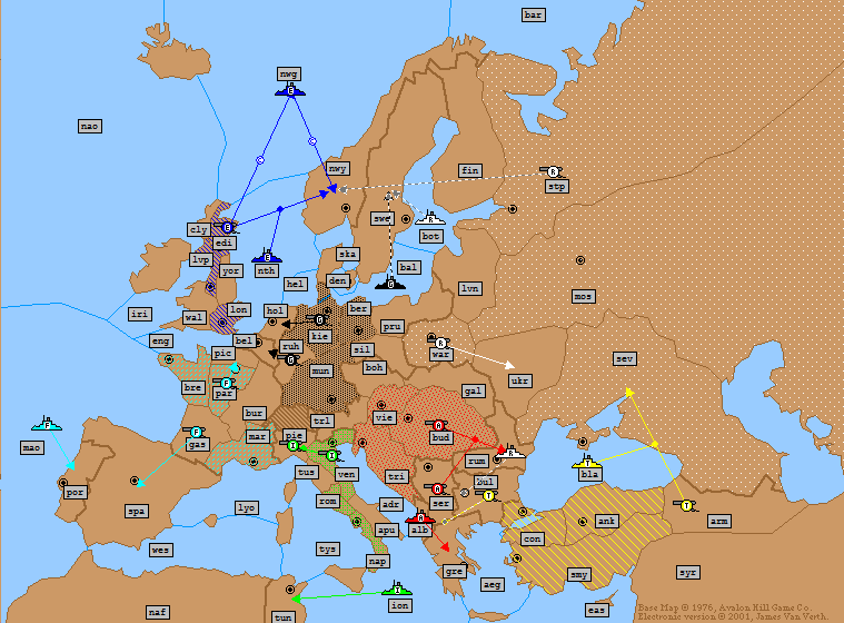 Austria: | A Silesia → Berlin A Ukraine → Warsaw A Galicia S A Ukraine → Warsaw A Rumania S A Armenia → Sevastopol (*Cut*) F Aegean Sea → Constantinople A Bulgaria S F Aegean Sea → Constantinople F Ionian Sea → Aegean Sea |
