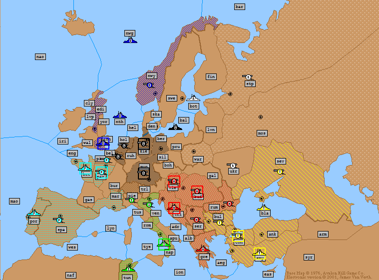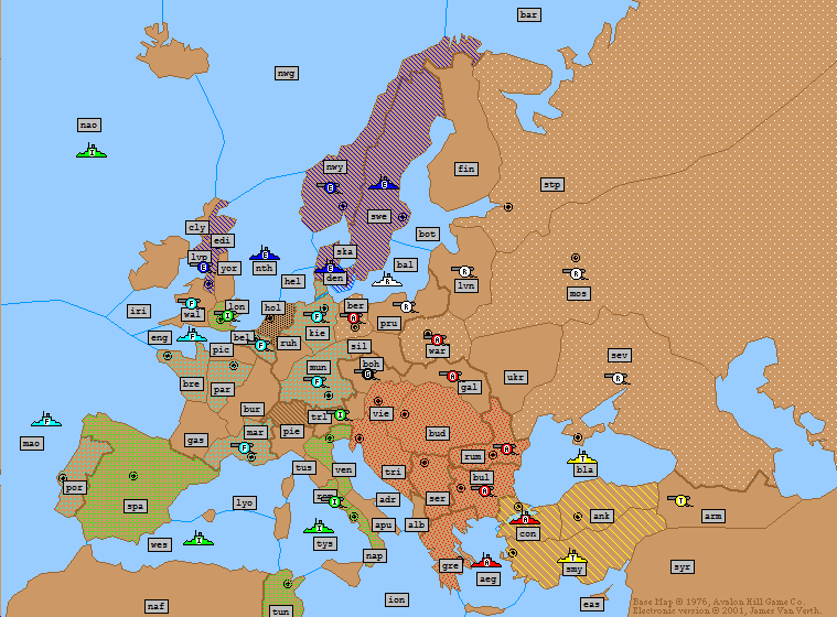 Austria: | A Trieste H A Rumania S A Sevastopol A Bulgaria S A Rumania A Serbia S A Bulgaria F Adriatic Sea → Ionian Sea F Greece → Aegean Sea (*Bounce*) |