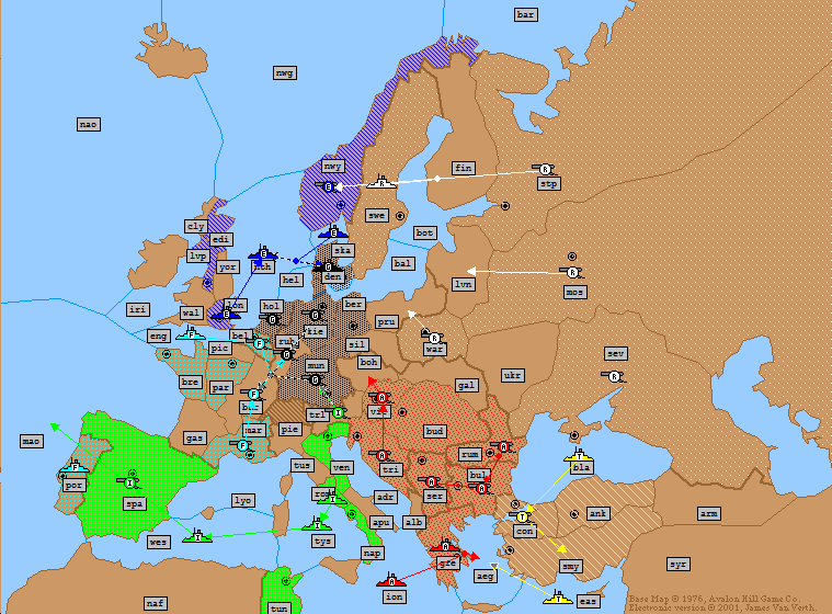 Russia: | F Gulf of Bothnia → Sweden (*Bounce*) F Rumania S A Serbia → Bulgaria (*Void*) (*Disbanded*) A St Petersburg → Norway (*Fails*) A Warsaw → Ukraine |