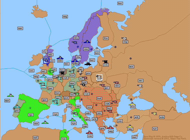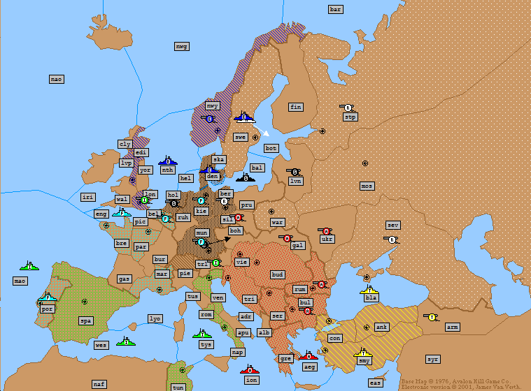 Germany: | F Baltic Sea → Sweden (*Bounce*) A Kiel → Holland A Ruhr → Belgium |