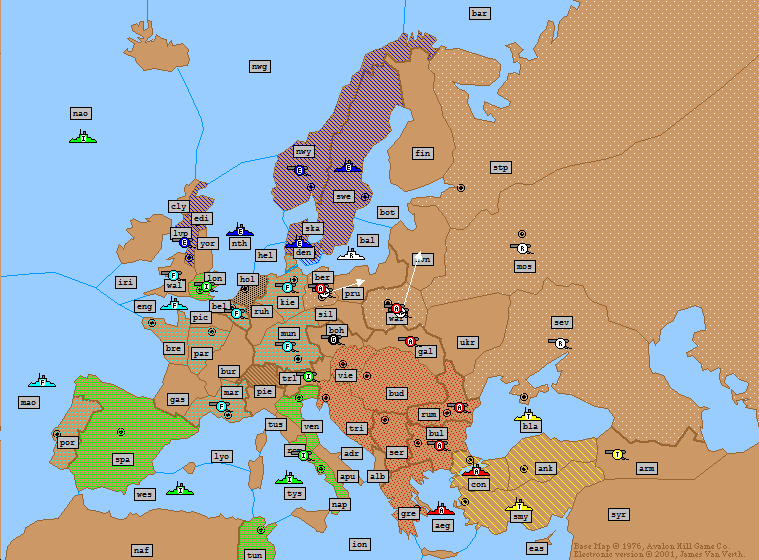 Russia: | F Gulf of Bothnia → Baltic Sea A St Petersburg → Moscow A Berlin S F Denmark → Kiel (*Dislodged*) A Warsaw → Galicia (*Dislodged*) A Sevastopol S F Black Sea → Rumania (*Cut*) |