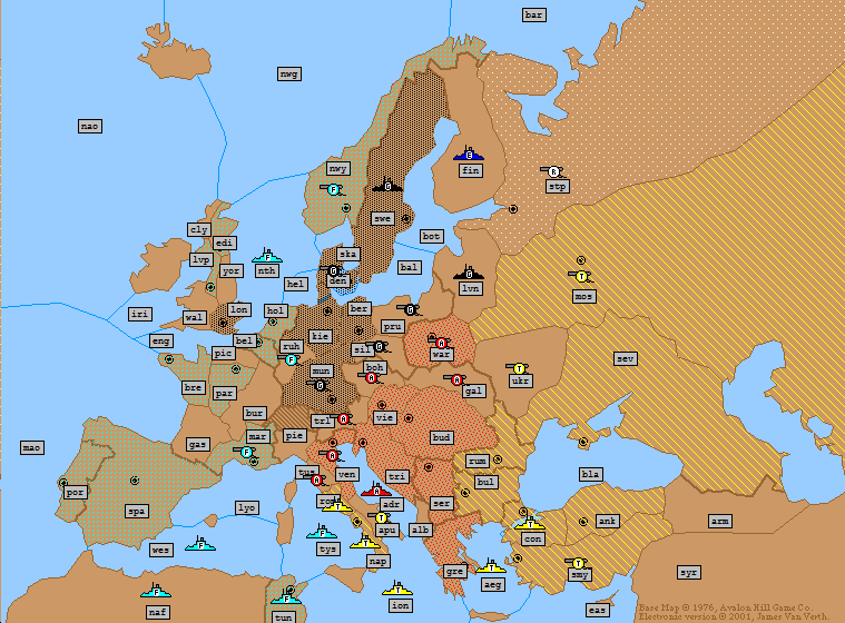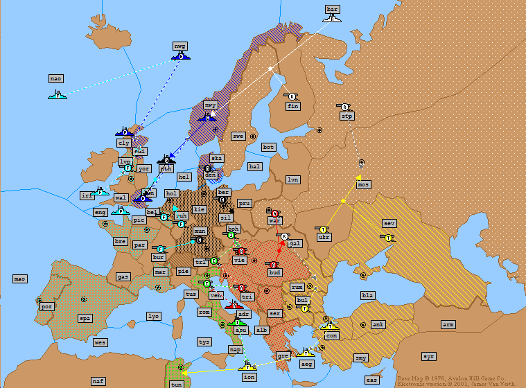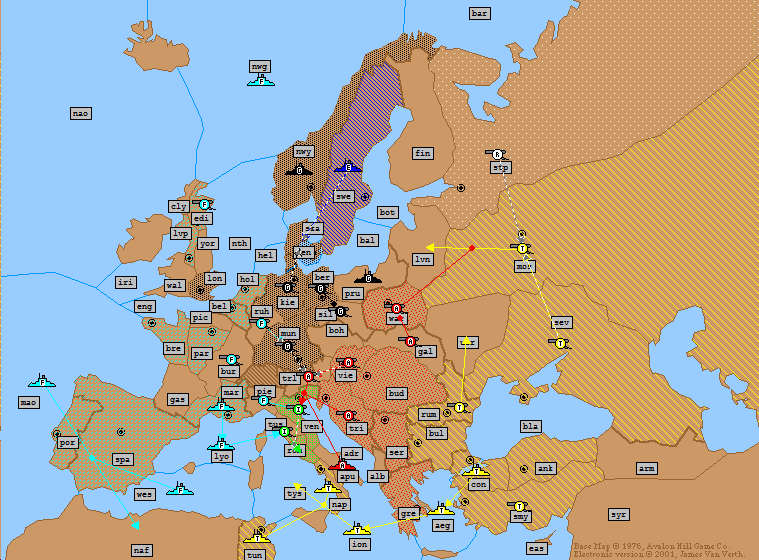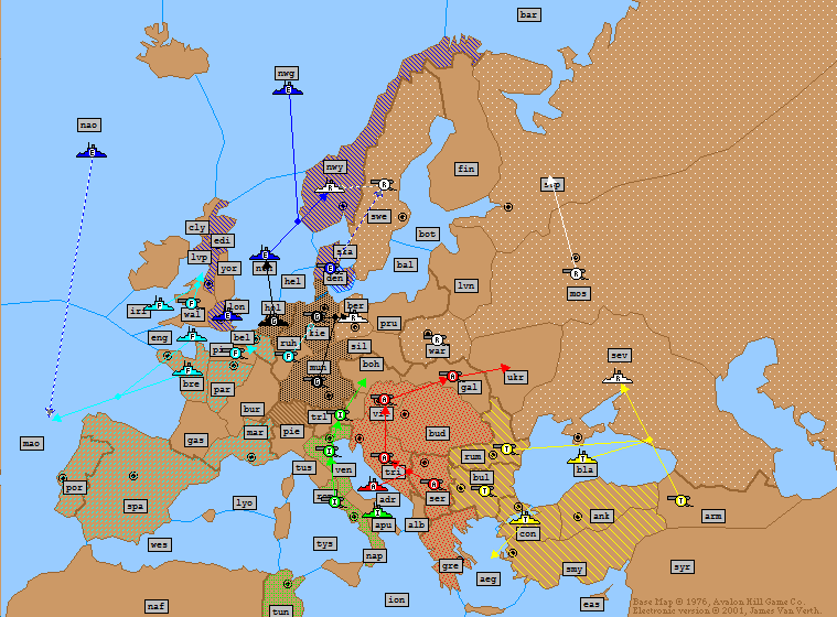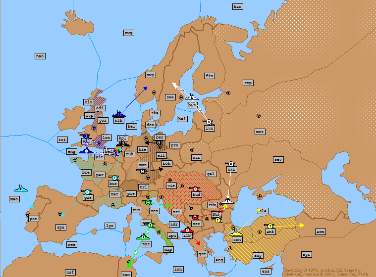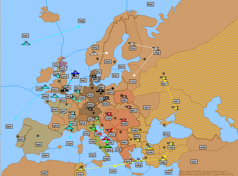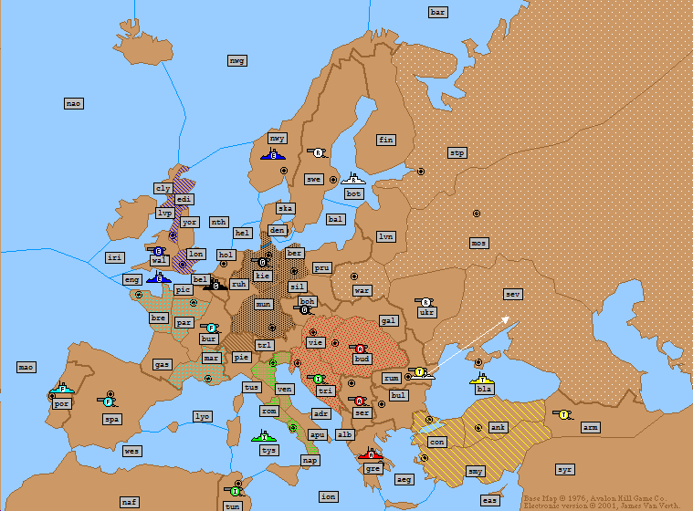 Turkey: | A Ukraine → Moscow A Sevastopol S A Ukraine → Moscow A Bulgaria → Rumania (*Bounce*) F Ionian Sea → Tunis F Aegean Sea → Ionian Sea (*Bounce*) F Constantinople → Aegean Sea (*Fails*) |