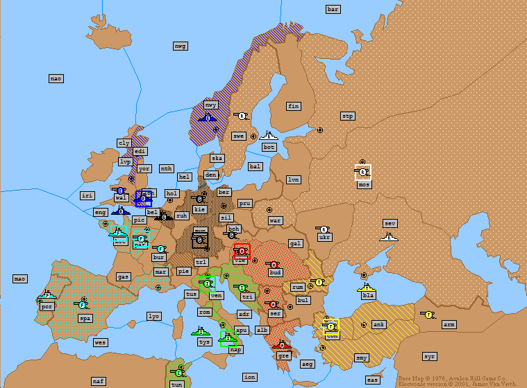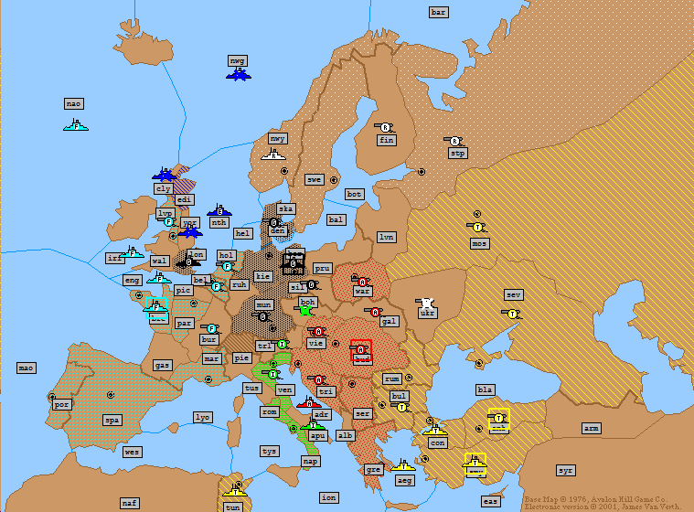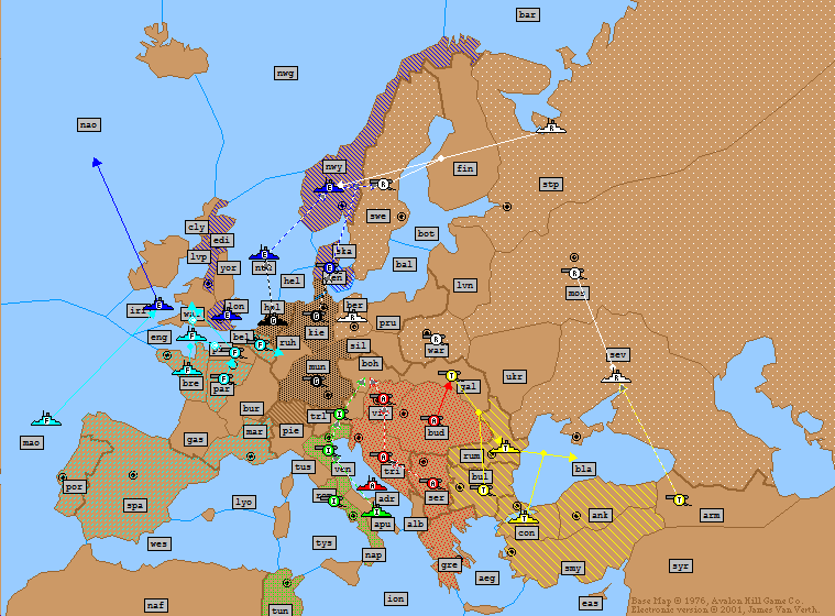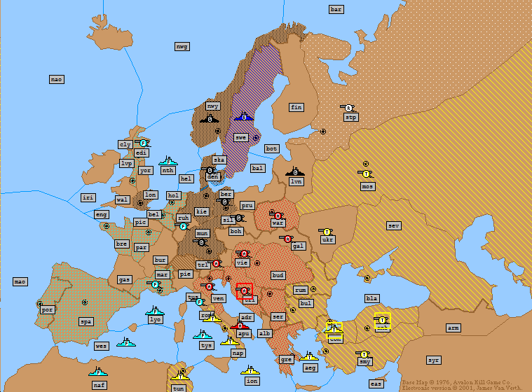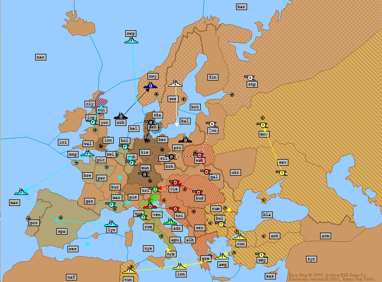 Turkey: | A Moscow H A Sevastopol S A Moscow A Bulgaria H F Constantinople H F Aegean Sea → Ionian Sea F Tunis S F Aegean Sea → Ionian Sea F Smyrna → Aegean Sea A Ankara → Smyrna |