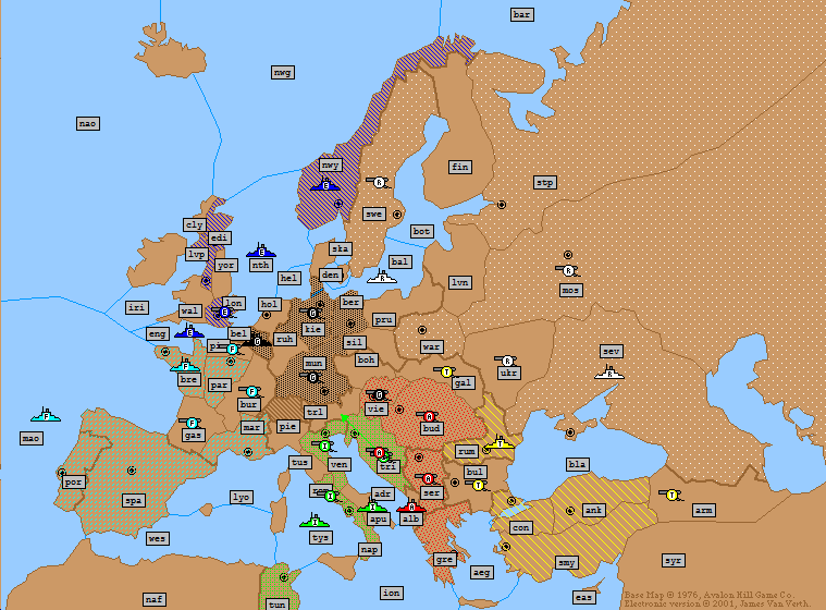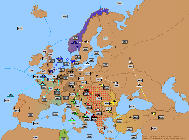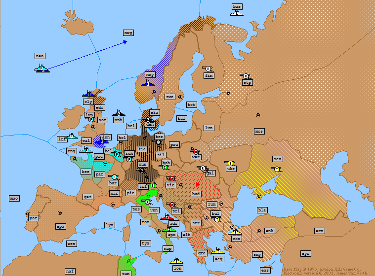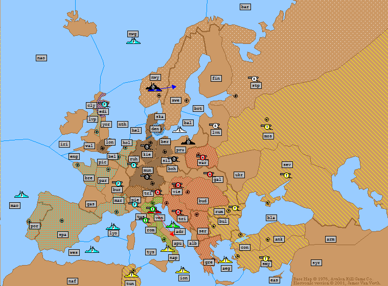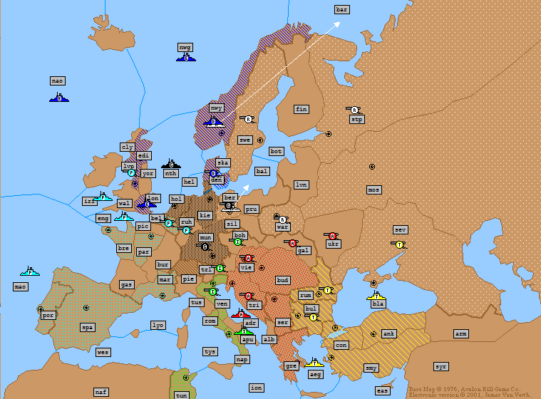 Russia: | F Barents Sea → Norway A Finland S F Barents Sea → Norway A St Petersburg → Moscow (*Fails*) A Galicia → Rumania (*Bounce*) (*Dislodged*) |