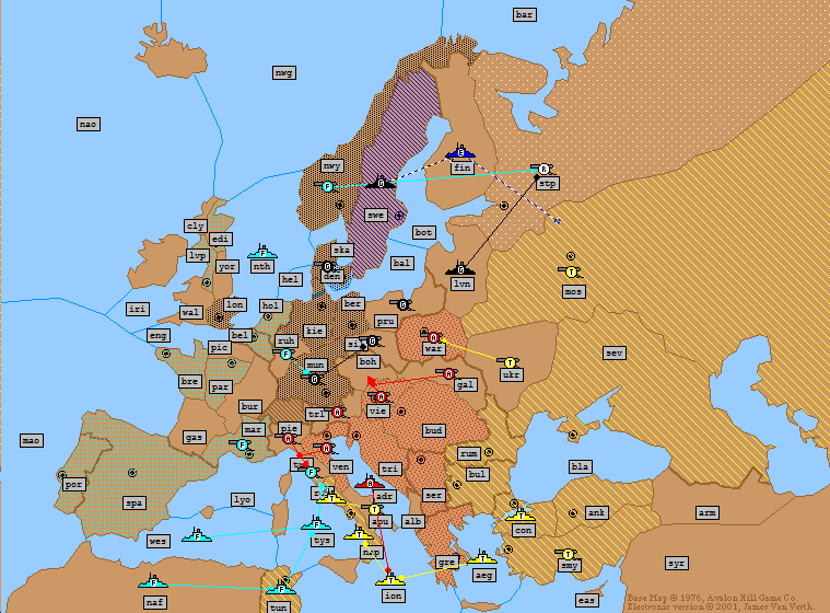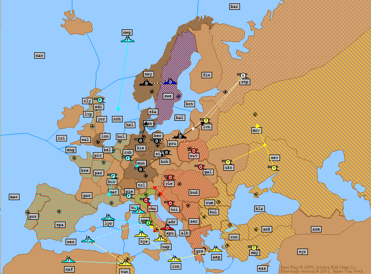 Turkey: | A Moscow → Livonia A Sevastopol → Moscow (*Bounce*) A Rumania → Ukraine F Ionian Sea → Tyrrhenian Sea F Naples S F Ionian Sea → Tyrrhenian Sea F Tunis S F Ionian Sea → Tyrrhenian Sea F Aegean Sea → Ionian Sea F Constantinople → Aegean Sea A Smyrna H |
