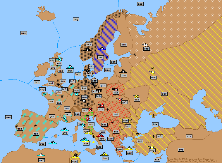 Russia: | A Sweden → Denmark (*Bounce*) F Gulf of Bothnia → Baltic Sea F Sevastopol H A Moscow S F Sevastopol A Ukraine S F Sevastopol |