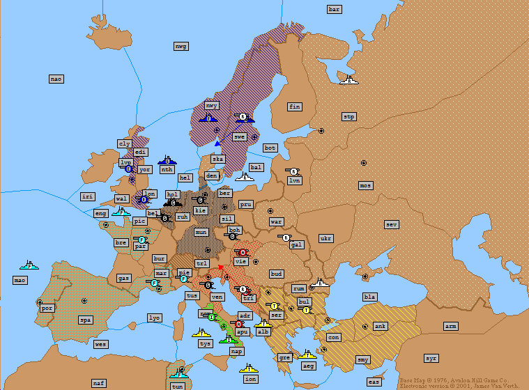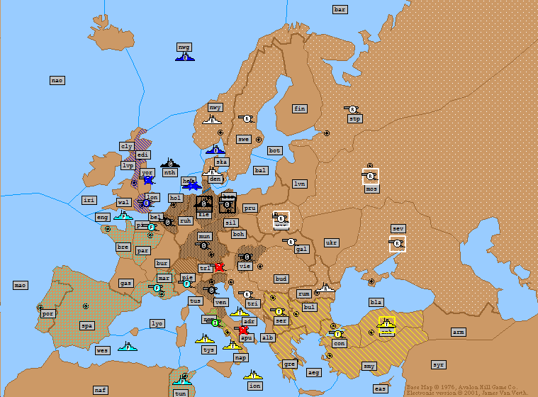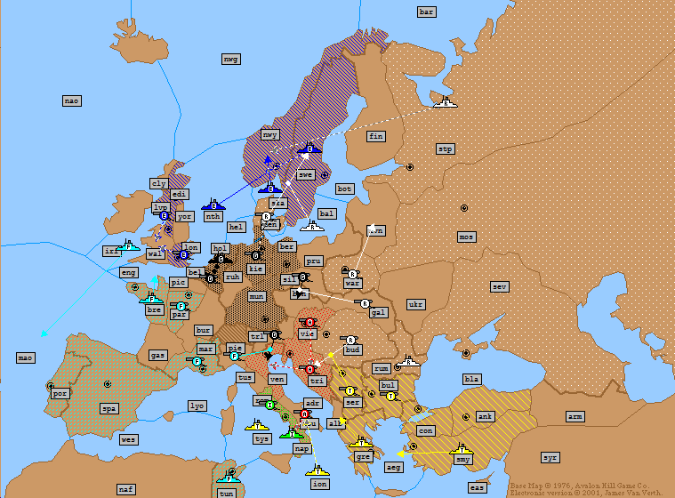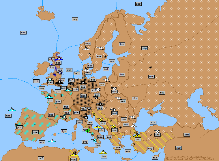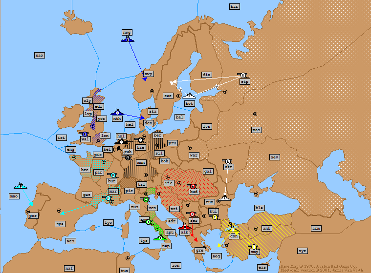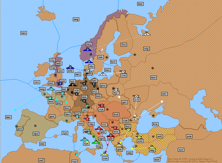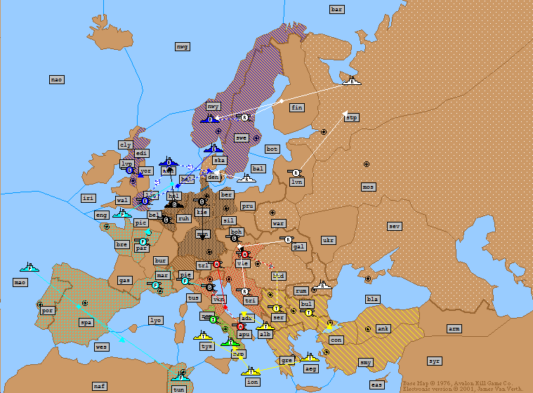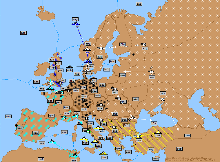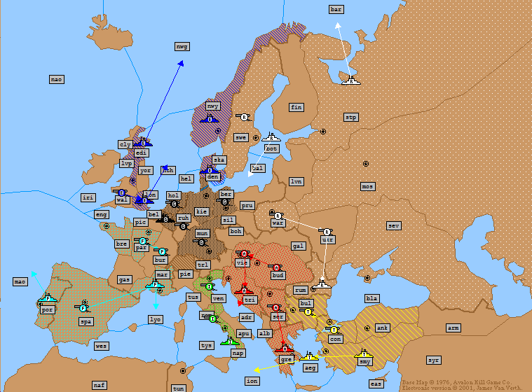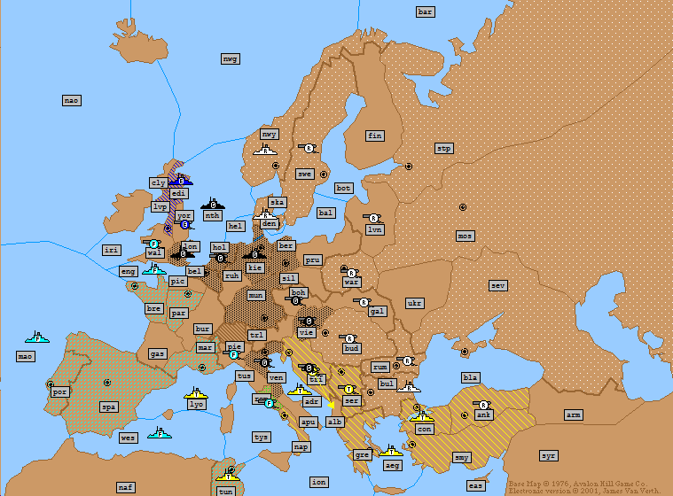 Turkey: | A Albania → Trieste F Adriatic Sea S A Albania → Trieste A Serbia S A Albania → Trieste F Aegean Sea → Ionian Sea F Constantinople H F Gulf of Lyon → Spain(sc) (*Bounce*) F Tunis → Western Mediterranean (*Fails*) |