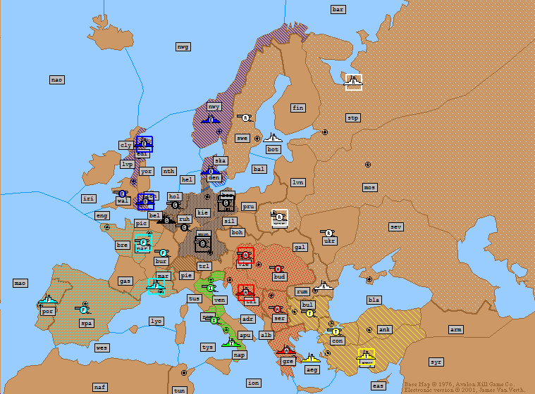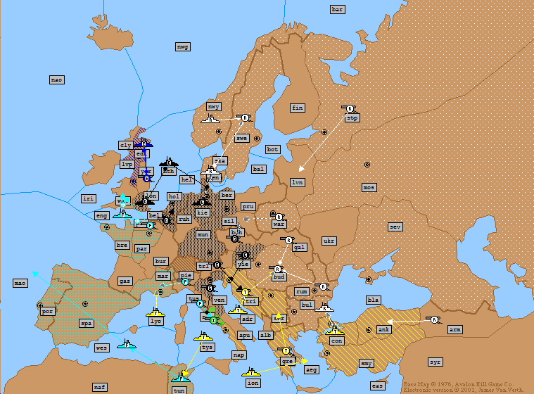Germany: | A Holland → Kiel A Berlin S A Holland → Kiel F Belgium → Holland A Munich → Tyrolia (*Bounce*) A Ruhr → Munich (*Fails*) |