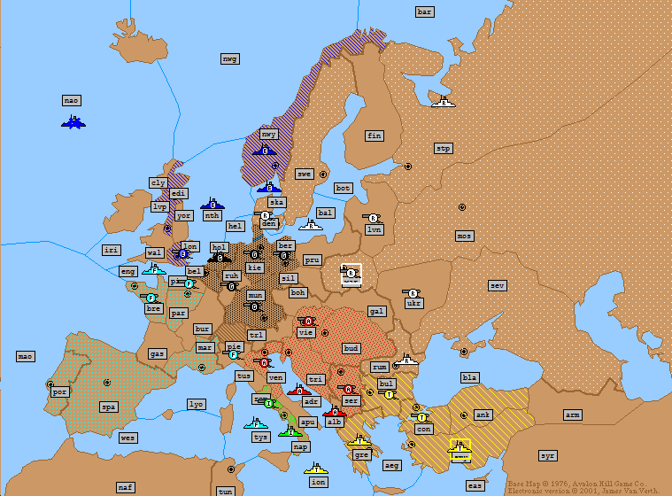 Turkey: | A Serbia → Budapest (*Bounce*) F Ionian Sea → Naples F Tyrrhenian Sea S F Ionian Sea → Naples F Aegean Sea → Ionian Sea F Albania → Adriatic Sea A Bulgaria → Constantinople |