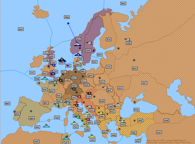 Russia: | A Armenia → Smyrna (*Bounce*) F Black Sea → Bulgaria(ec) A Rumania S F Black Sea → Bulgaria(ec) A Galicia → Vienna (*Fails*) A Budapest S A Galicia → Vienna A Livonia → Warsaw F Skagerrak → Denmark A St Petersburg S F Norway F Norway S A St Petersburg A Sweden S F Denmark → Sweden (*Fails*) |